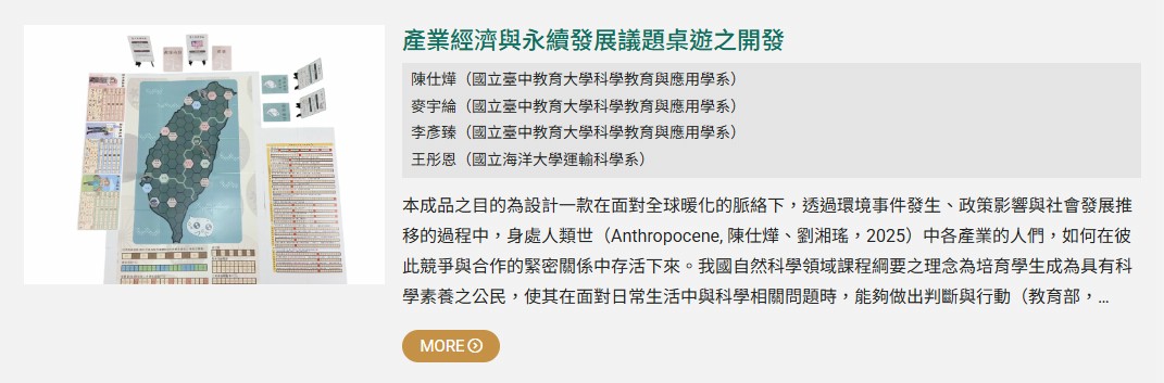 賀!本院科學教育與應用學系陳仕燁老師,指導大學部麥宇綸與李彥臻同學,將本院「跨領域專題製作」課程成果——「產業經濟與永續發展議題桌遊之開發」,正式刊登於國科會實作學門電子期刊(電子報)。此項殊榮不僅肯定了本院師生在跨學科整合的研發實力,更展現了科教領域在永續發展教育上的實踐成果。電子報連結如下:https://www.sepd.com.tw/index.php/journal/article/list/3